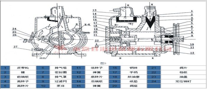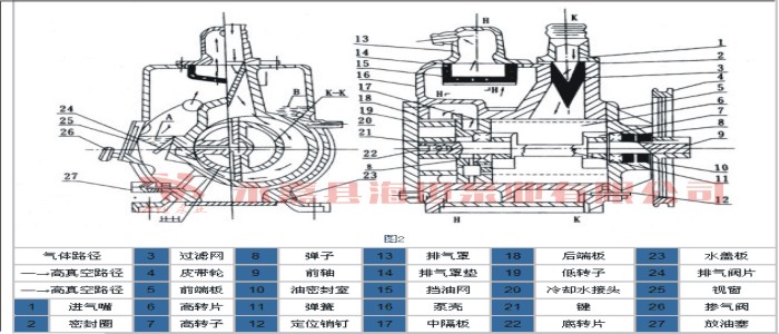 2、装配前应清洗干净并烘干,按图4进行装配,先装高真空端,将弹簧转片托起装入高转子内,然后放进高真空室,装上前端板,再装定位销钉,均匀拧紧螺钉,装配后应保证转动灵活轻松 ,均匀一致。然后再装低真空转子及后端盖,低转片的槽应向后端板一边。再装排气门,排气阀片应贴紧阀板坐,再装其它零件。