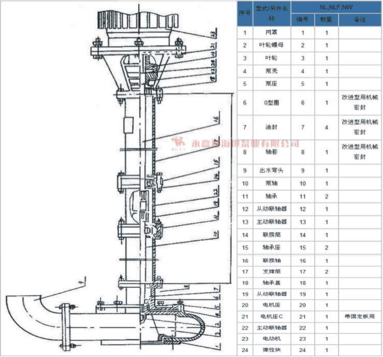 NL系列泥浆泵系单级单吸立式离心泵,主要部件有蜗壳、叶轮、泵座、泵壳、支撑筒、电机座、电动机等组成。蜗壳、泵座、电机座、叶轮螺母是生铁铸造、耐腐性、耐腐蚀性较好,加工工艺方便。