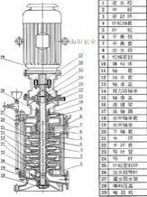 DL立式多级泵由电机和泵两部分组成,电机为Y型三相异步电机,泵和电机采用联轴器连接,整体为刚性连接,使用时无需校正。泵由定子部分和转子部分组成。泵定子部分由进水段、中段、导叶、出水段、填料函体等零件组成。为防止定子磨损,定子上装有密封环、平衡套等,磨损后可用备件更换。转子部分由轴、叶轮、平衡毂等组成。转子下端为水润滑轴承,上部为角接触球轴承,DL立式多级泵的轴向力绝大部分由平衡鼓来承担,其余小部分残余轴向力幅角接触球轴承来承受。进水段和出水段和结合面用纸垫通过接紧达到密封。轴封采用填料或机械密封,用户可根据需要选择。