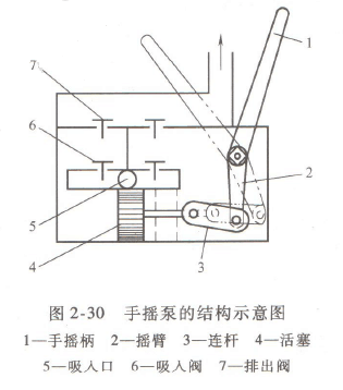手摇泵大多用于各种辅助操作上。一般在体力消耗不大的情况下,把液体从容器内抽吸出来,或把液体输送到容器中去。因此手摇泵一般排出压力不高,流量也不大。大多用来抽吸水和油类等液体。一般手摇泵多为活塞式的往复泵。图为2-30所示的是一种单杠双作用活塞式手摇泵,活塞两侧各有一个吸入阀6和排出阀7.活塞4通过连杆3、摇臂2等机构和手摇柄1相连,当用手来回摆动手摇柄1,即可带动泵缸内的活塞4作往复运动,从而使活塞两侧吸入阀6分别从吸入管内吸入液体,并从排出管排出液体。